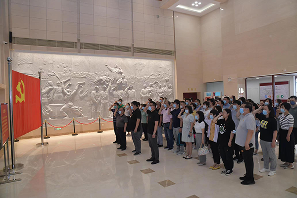 在瞻仰厅,预备党员和老党员一起面对党旗庄严宣誓,重温入党誓词,铿锵有力的宣誓,表达了大家对听党话、跟党走的坚定决心。